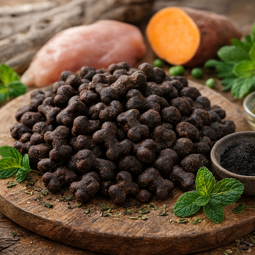 Dieser Snack knuspert wie Muschelkalk unter den Pfoten: Truthahn (46 %), Wildschwein (4 %), Süßkartoffel, dazu Aktivkohle, Petersilie und Grüntee-Extrakt. Eine crunchy Mischung, die einfach Sinn ergibt, wenn’s um tägliche Maulhygiene geht.